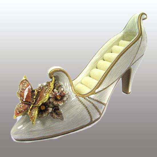 This ring holder portrays a distinctive high-heel shape. The butterfly and floral detailing adds a sophisticated touch to the design. It makes a stunning display with practical function.