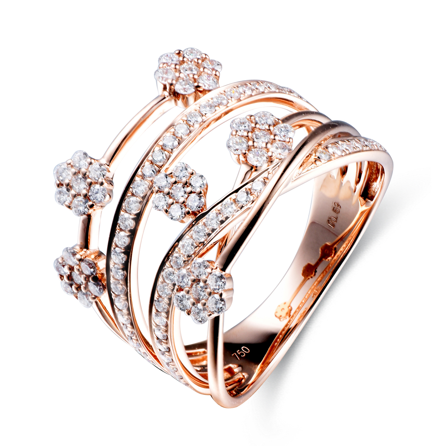 A contemporary cross-over ring with 6-in-1 composite heads, available in 14K & 18K