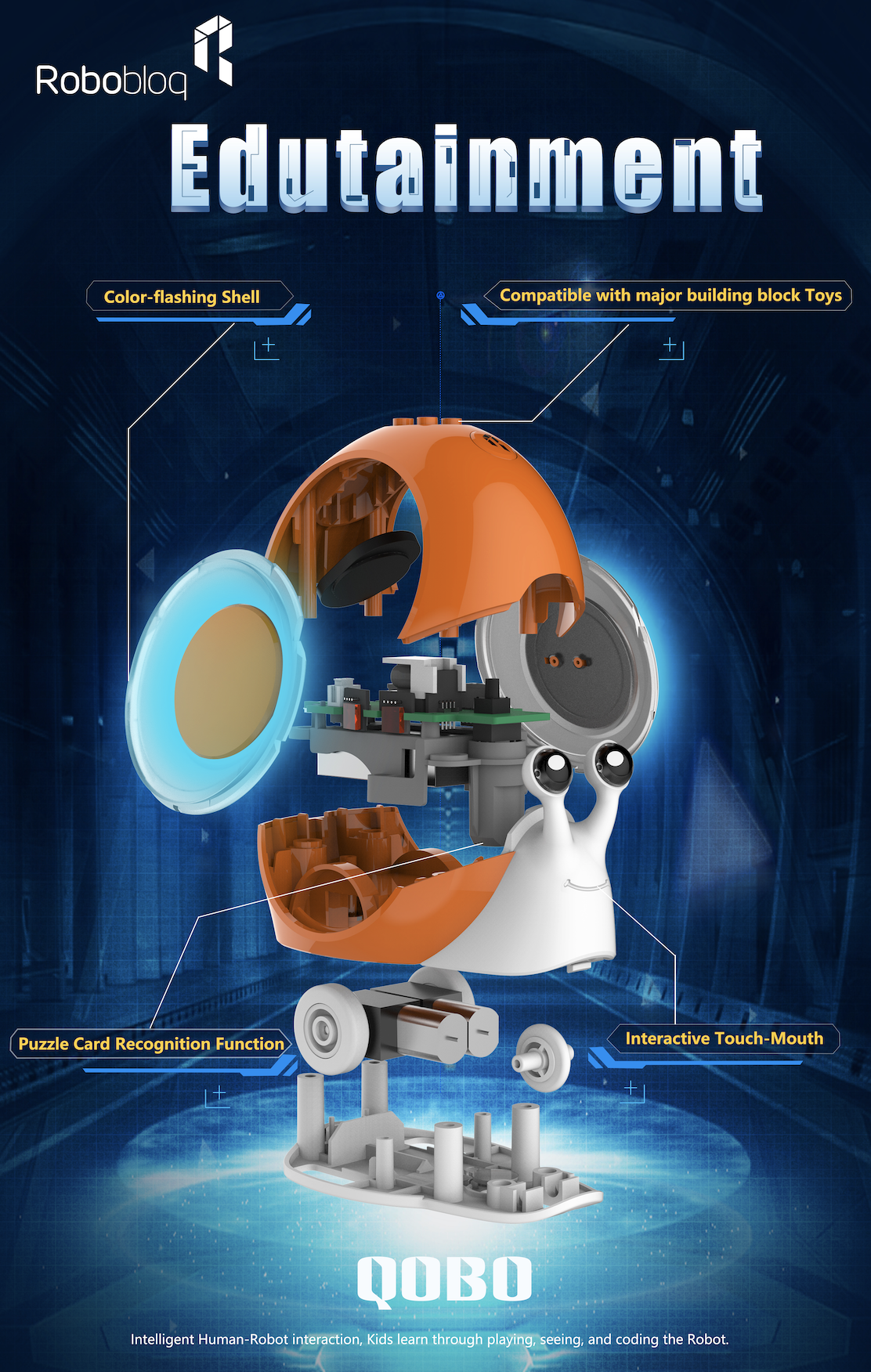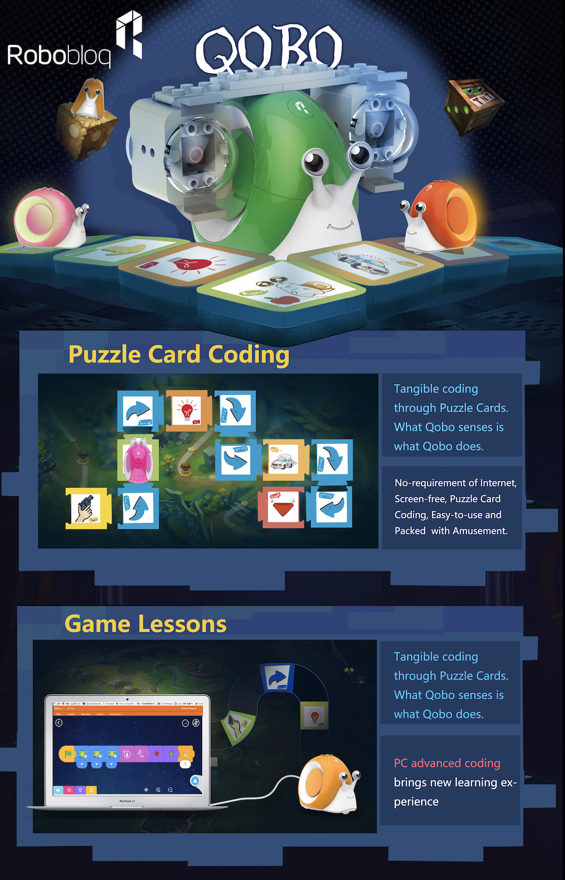 Adventurous with Qobo by tangible coding ! Innovative programming by coded puzzle cards to move, sing, flashing and interact. One card-one world. Attach your growth and learn with fun.