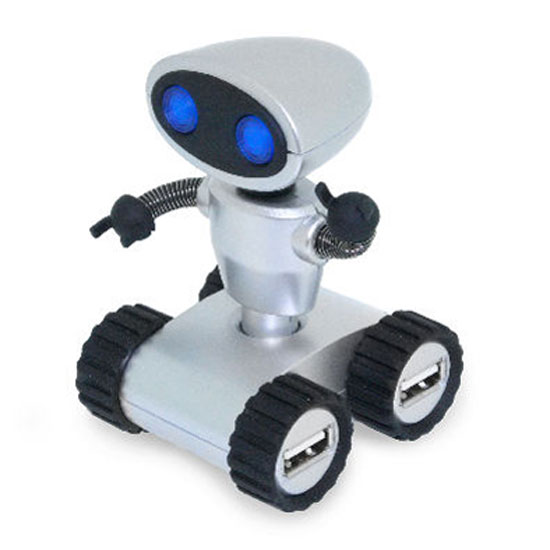 Pictured is a robot-looking USB hub with LED eyes to indicate data activity. The robot has 4 USB ports where you can plug in your mouse, keyboard or any other USB device without having to use up all your USB ports on your computer. This fun little desktop hub has movable arms and glowing blue LED eyes when transferring data. It comes with an extension cable and is great for getting the most out your hardware.