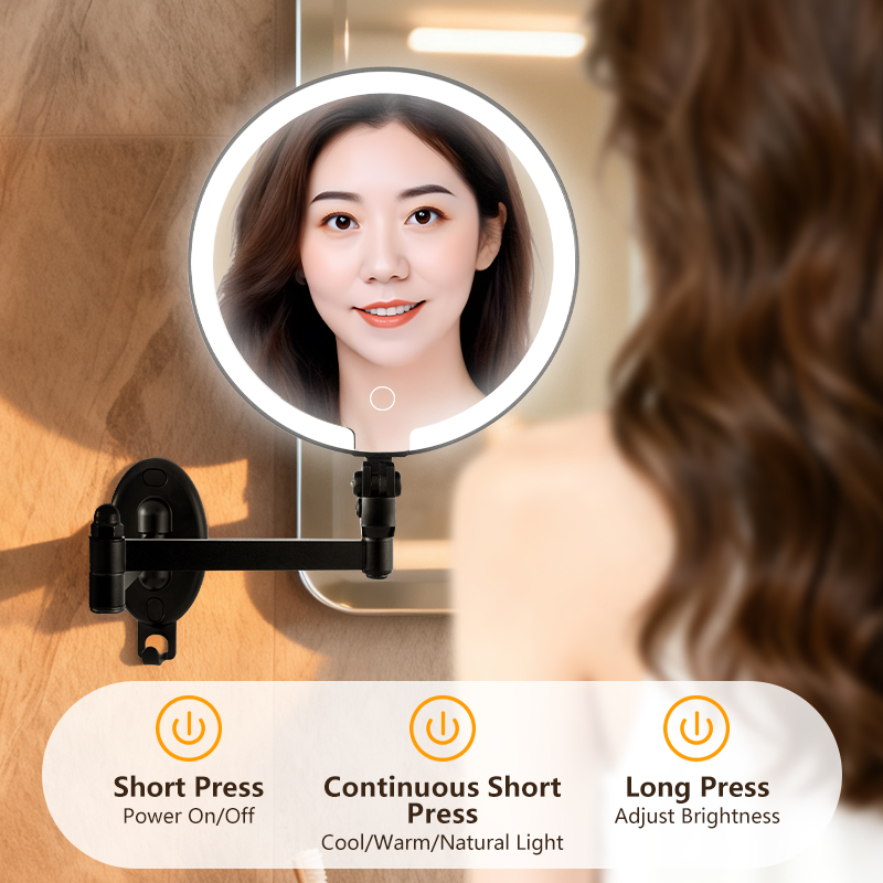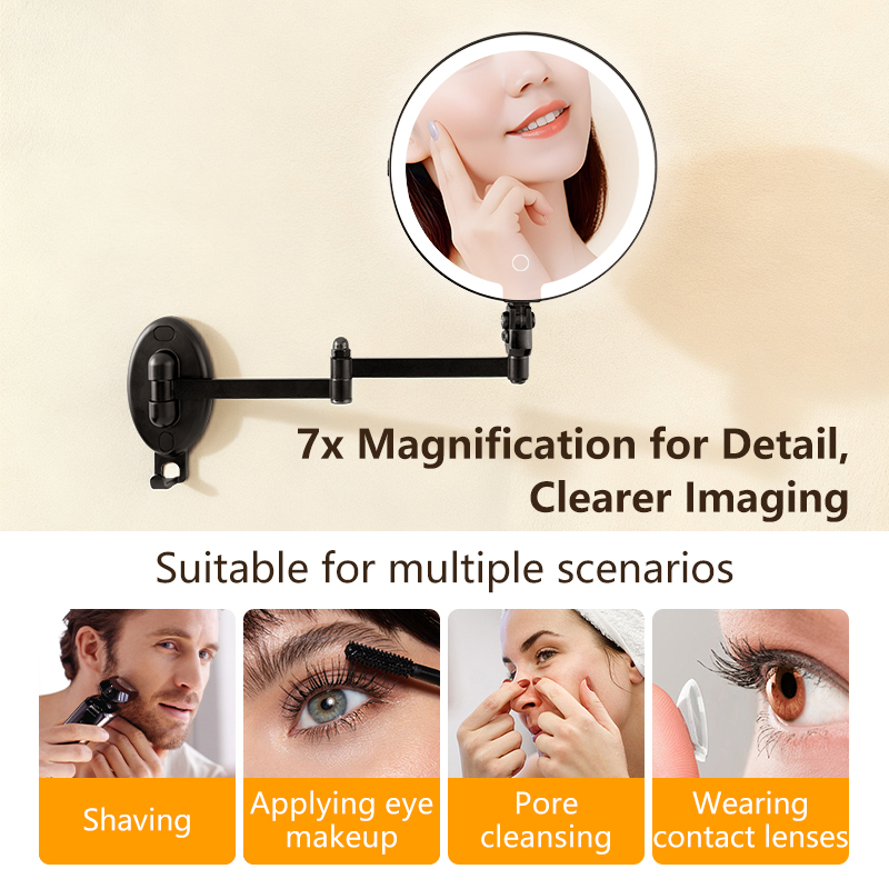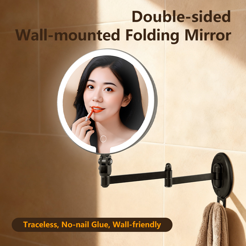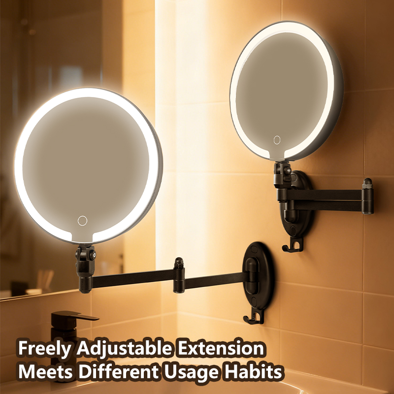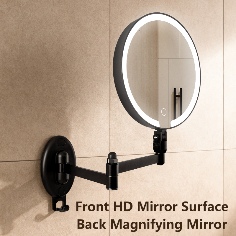 Flexible Adjustment — 360° universal swivel arm for free stretching and folding at any angle; Dual-Sided Design — standard mirror on one side, magnifying mirror on the other for flawless makeup and skincare details; Space-Saving — wall-mounted or countertop use with foldable storage; HD Imaging — distortion-free mirror for true color reflection. Perfect for bathrooms and dressing tables.
