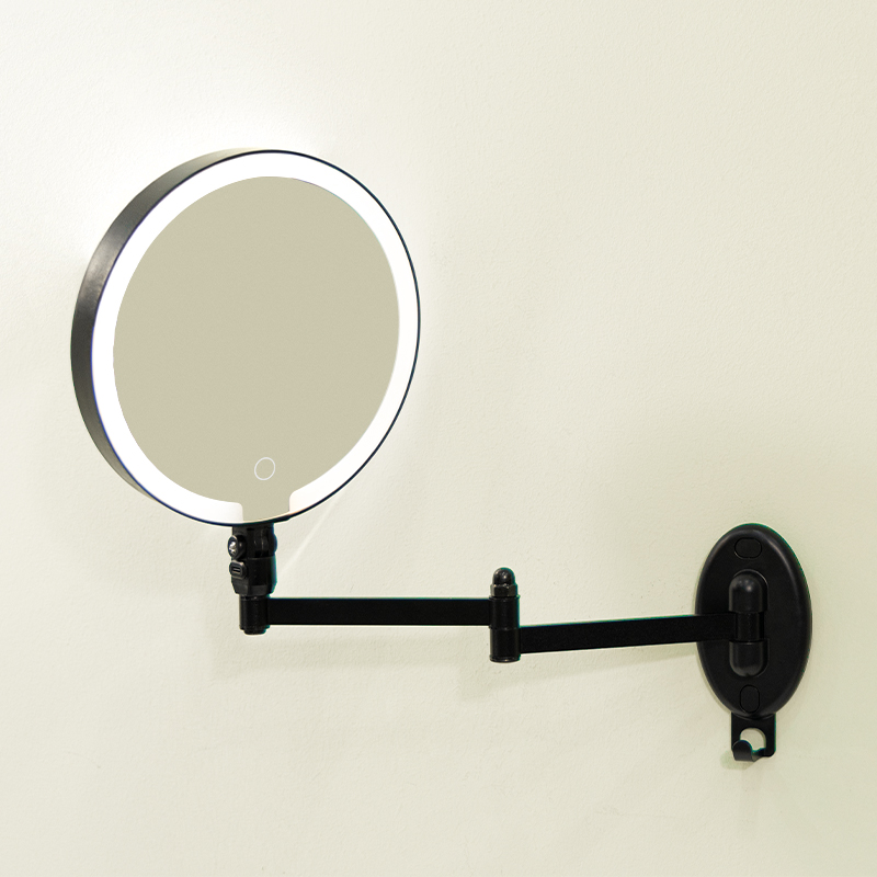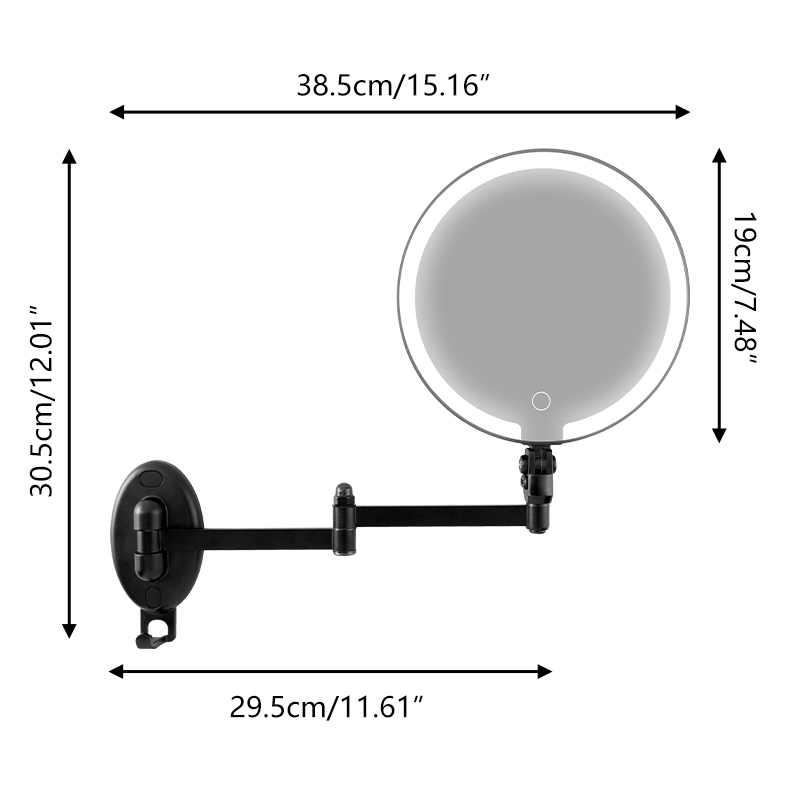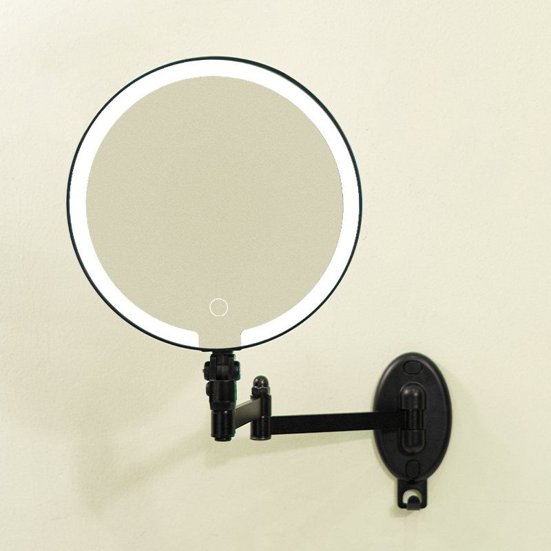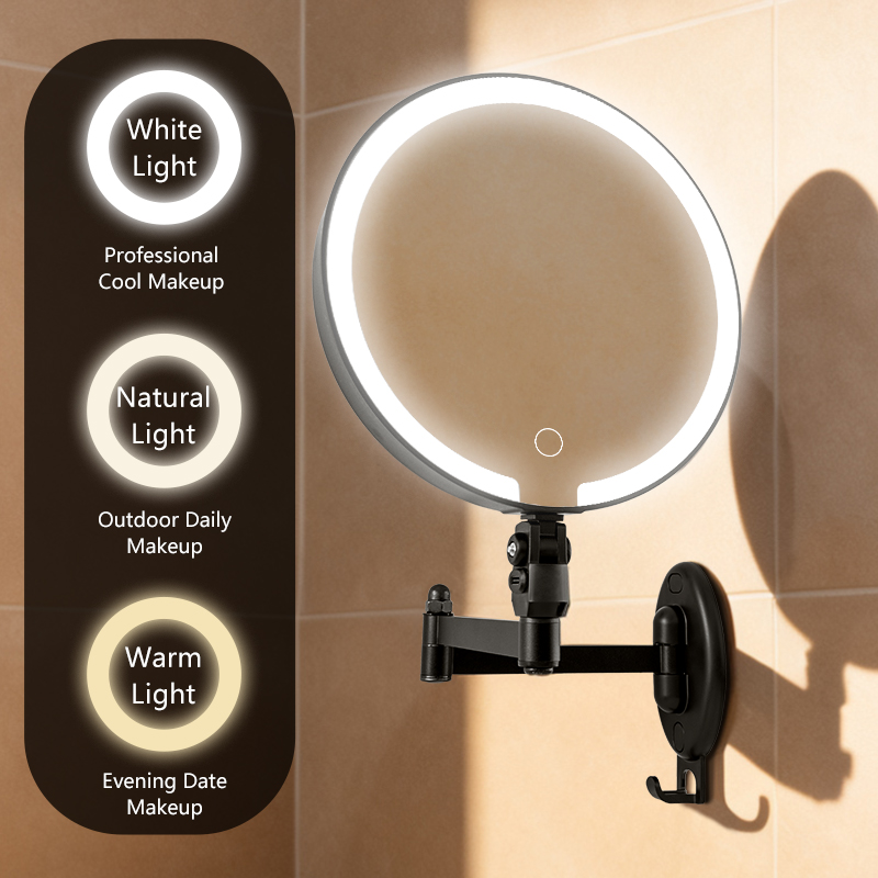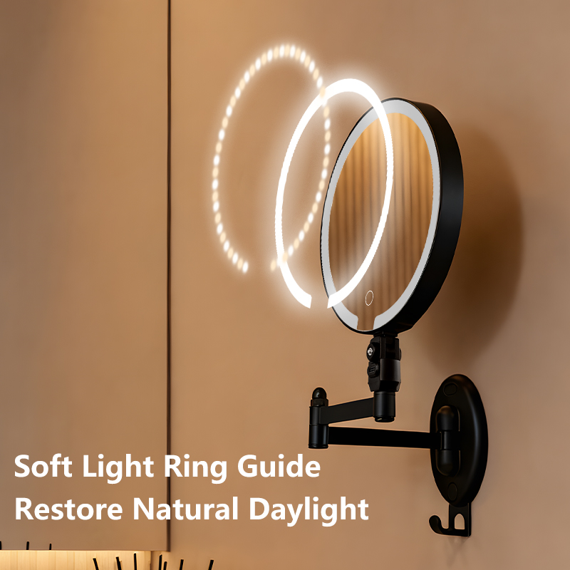 Flexible Adjustment — 360° universal swivel arm for free stretching and folding at any angle; Dual-Sided Design — standard mirror on one side, magnifying mirror on the other for flawless makeup and skincare details; Space-Saving — wall-mounted or countertop use with foldable storage; HD Imaging — distortion-free mirror for true color reflection. Perfect for bathrooms and dressing tables.