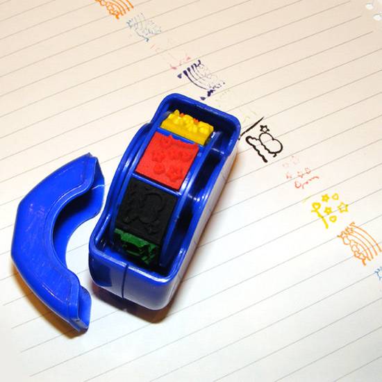 This is a blue plastic roller stamp with a lid. Users can roll over and stamp different patterns on papers. Each stamp is designed with different colours.