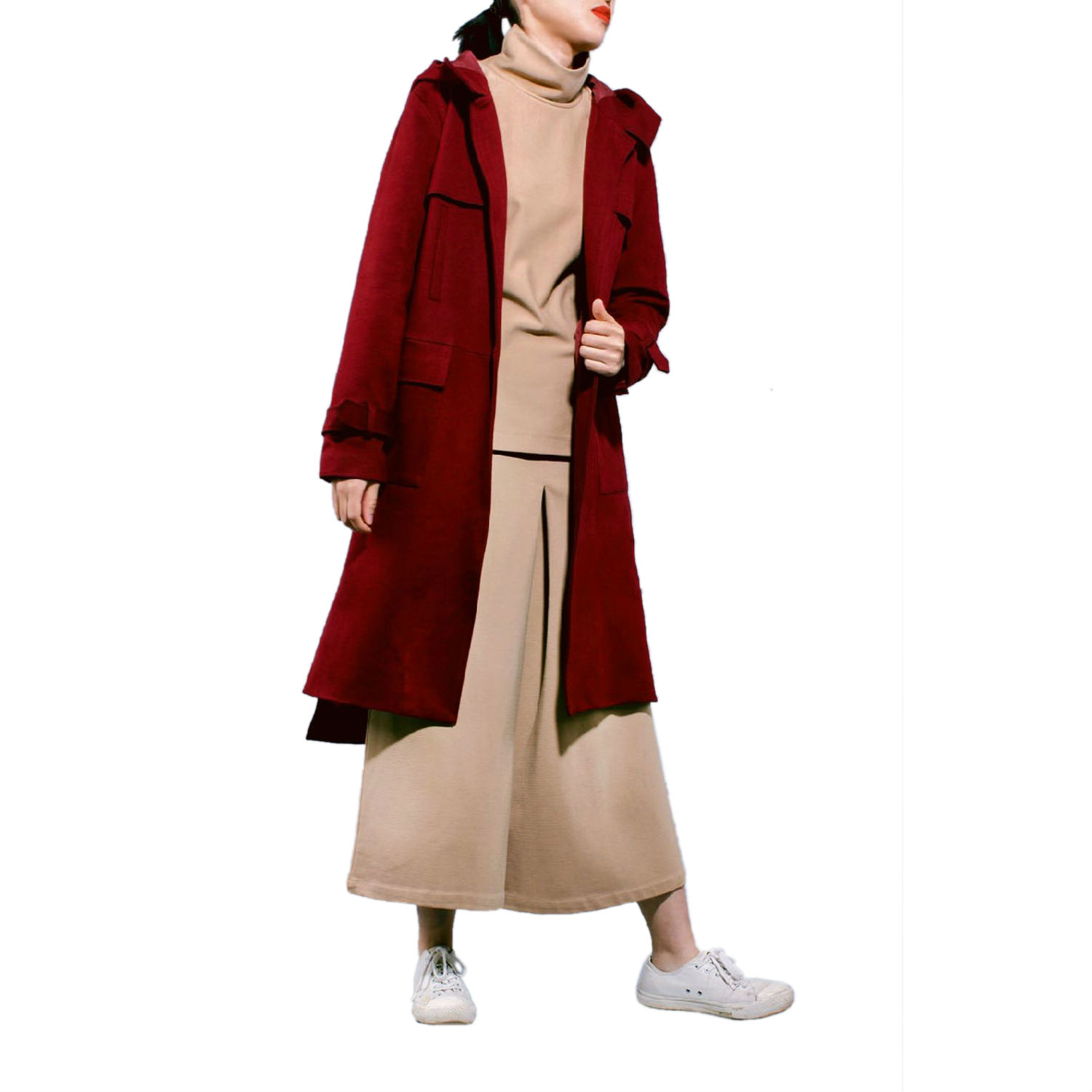 Matching with a ribbon top, culottes and coat, this stunning set charms up you winter look in beautiful earth tones. The loose-cut top comes with a turtleneck keep the casual style with elegance while the matching culottes explore relaxed proportion in a simple silhouette with cropped and wide legs. The knee-length coat jumps out in red wine shade, completing the ensembles with a splendid highlight.