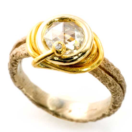 This vintage-inspired ring uses a combination of 24K and 18K gold to craft the band. The ring is topped with a rose-cut diamond. The dazzling ring is a classy and valuable addition to your jewelry collection.