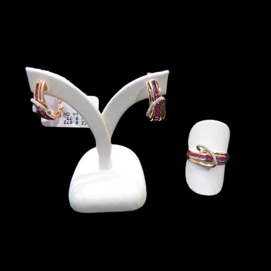 This is a pair of earrings with a unique and fashionable design. Each piece is mainly made of 14K rose gold with a strip of diamond decorations which diagonally goes through the main structure. The ruby elements add a touch of bright color to each earring.