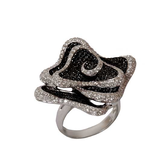 This stunning rose ring is adorned with tiny black and white stones in micro-pave setting. The vivid rose ring showcases excellent craftsmanship with refined details. A highly polished finish adds a distinctive look of elegance to this rose ring.
