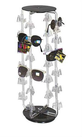 Attractive rotating countertop eyewear display draws customers while making it easy for them to browse and select items. Displays 24 pair of eyeglasses/sunglasses in clear plastic uprights with black top and rotating base. Dimensions: 20''h x 7''w.