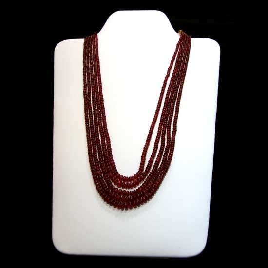 This splendid necklace features heavy strands of perfectly round beads, glistening in implicit radiance of a dark red complexion. The beads have high surface smoothness and excellent luster. This red bead necklace is fancy enough to bring out your unique character and individuality.