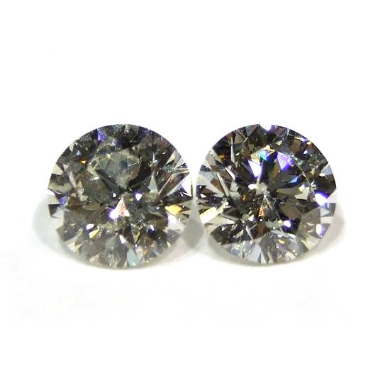 This pair of diamonds is in a round shape. Round-shaped diamonds are valuable because their surfaces have a 360-degree symmetric shape that can reflect lights from every angle. With the faceted nature, they can reflect the most amount of lights, which create a sparkling picture.
