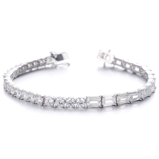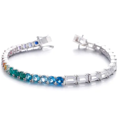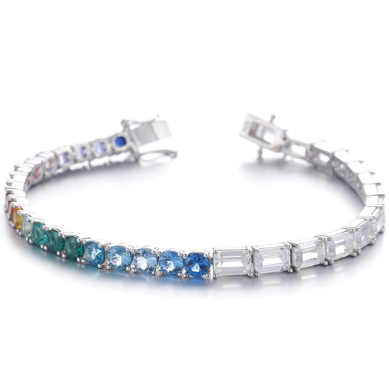 Round Rainbow Color And Emerald Cut White Cubic Zircon Rhodium Silver Bracelet