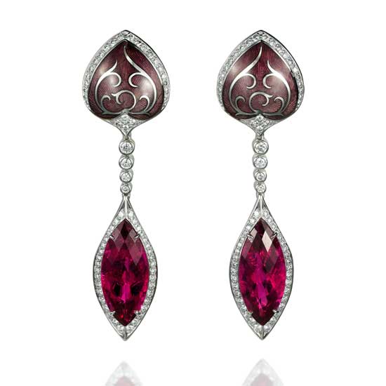 This pair of ear clips comes with a heart-shaped design on the top and an olive shaped rubellite dangling naturally. The sophisticated craftsmanship offers the ear clips a shiny and radiant appearance. This pair of ear clips goes great with a hot evening dress.