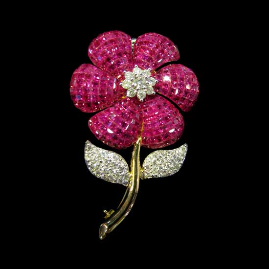 This brooch is designed in a beautiful and sparkling sun-flower shape with two leaves. The petals are paved with charming ruby stones and the stamen is crafted with shimmering diamonds, showcasing a vivid and realistic flower appearance. With excellent craftsmanship, this brooch surely is a chic addition to ladies' fine jewelry collection.