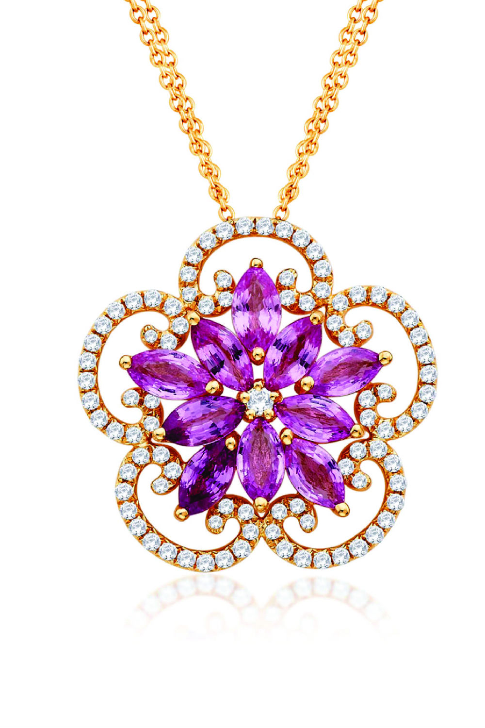 Pendant with ruby and diamond set in pave setting in yellow gold