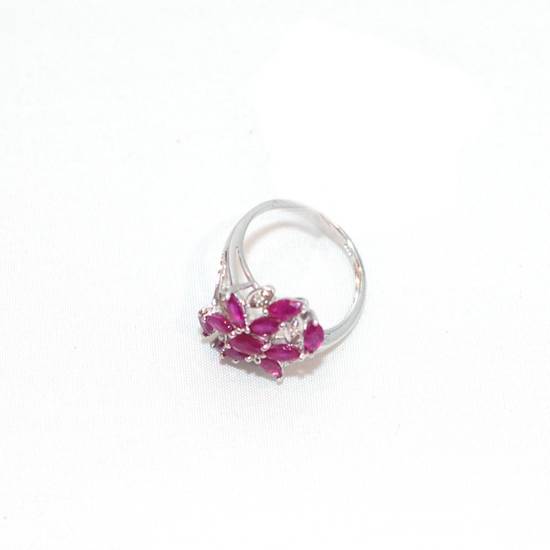 This is a ring decorated with rubies and diamonds. The rubies are purplish red in color of marquise design. The ring can be made with 14K or 18K white gold.