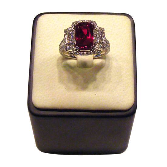This is a ruby ring. It comes with a emerald shape ruby in step cut, mounted with white diamond beads around it.