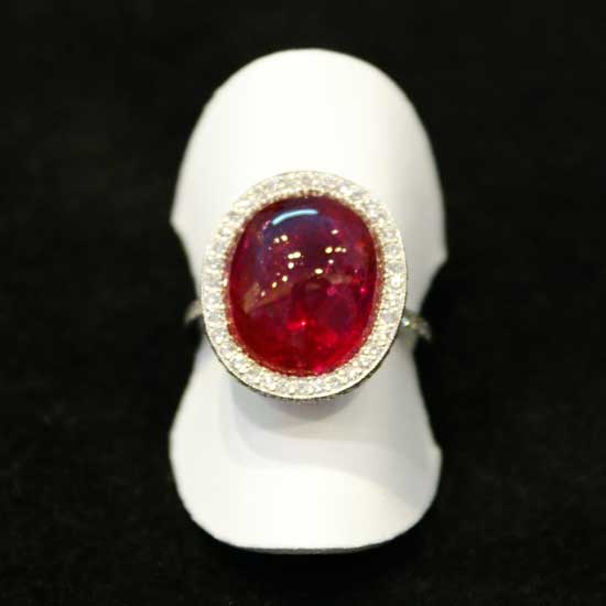 Highlighted is a ladies’ ring set with a spectacular ruby. The premium Burmese ruby comes with an oval-cut design. Diamonds are set around the ruby to showcase the incomparable beauty of the gem.