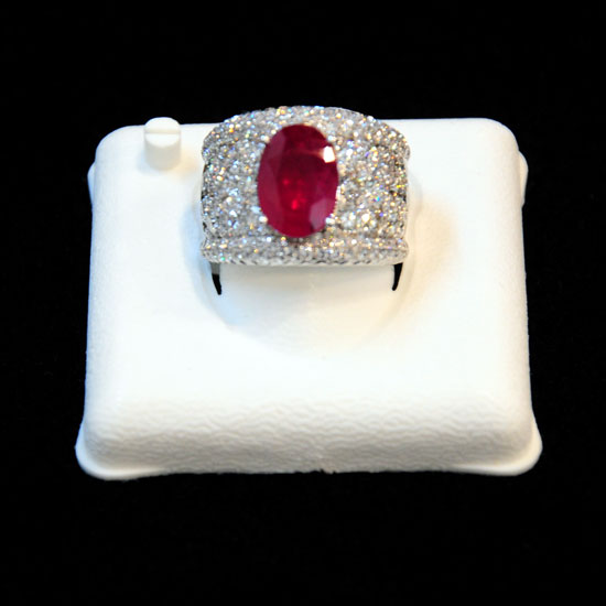 The oval-cut ruby stands out from a background studded with sparkling accents. The ruby shows a beautiful and vivid red to capture eyes of appreciation. The 18K gold ruby ring is a decent addition to your fine jewelry collection.