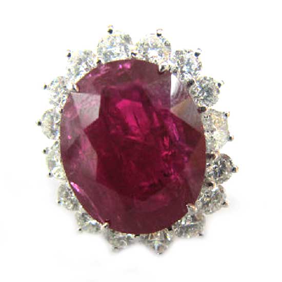 This finger ring features a large oval-cut Mozambique ruby gemstone as the center piece that weights 17.13 karats. The sparkling white diamonds surrounding the gemstone add a luxurious and glamorous accent to its look. This ruby finger ring is a stylish piece to match evening dresses.
