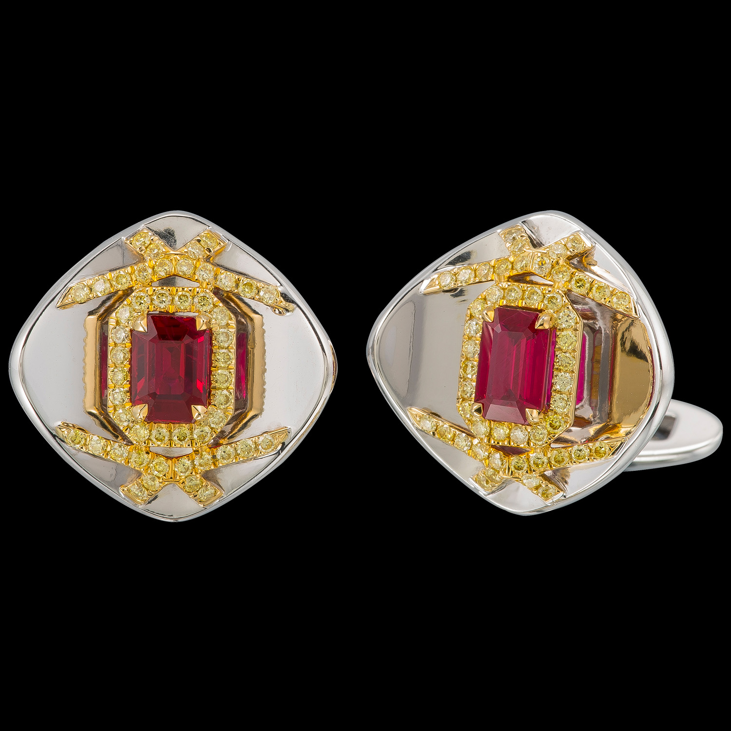 Inspired by ancient shields, this unique pair of cufflinks feature a ruby centerpiece adorned by a diamond pave detailing.