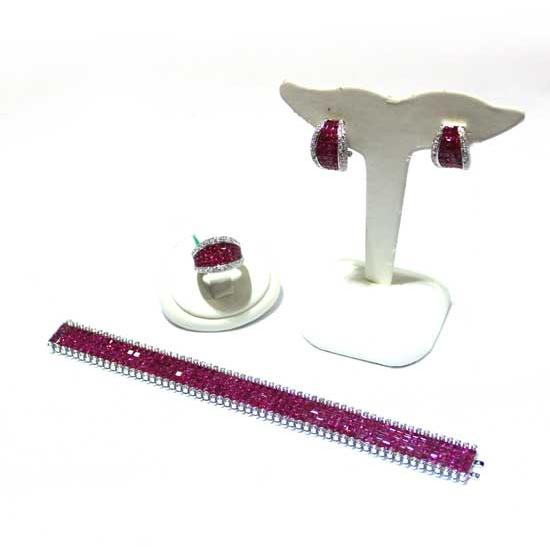 This exclusive three-piece jewelry set is adorned with micro-pave ruby and diamond. The ring, bracelet and earrings deliver irresistible shine for any angle. Add sparkle and glamor to your evening look with this stunning jewelry set.