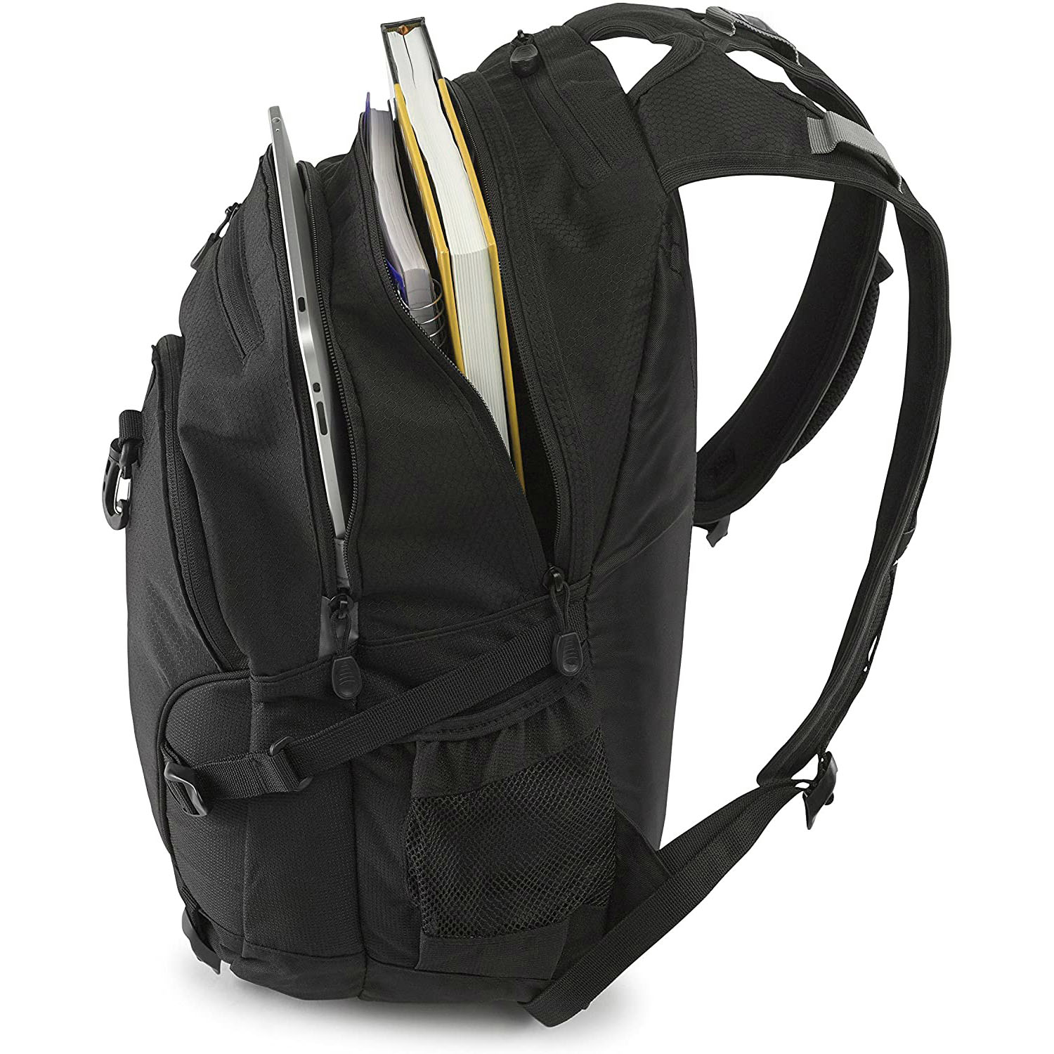 Multiple divider pockets, easy for holding 15.6 Inches laptop, water bottle, readers and a bunch of other items, Pad, journal, pens and pencils, Phone.