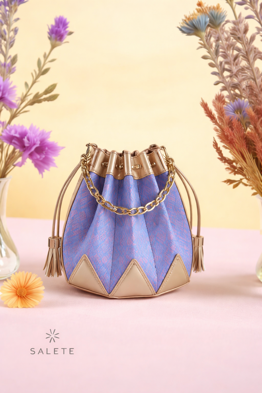Named after the Salete flower, a graceful, fragrant bloom of Northeastern Thailand, this bag reinterprets local identity through contemporary design. Originating from Khon Kaen, it is crafted from handwoven Thai mudmee silk and leather, seamlessly combining tradition with everyday functionality.