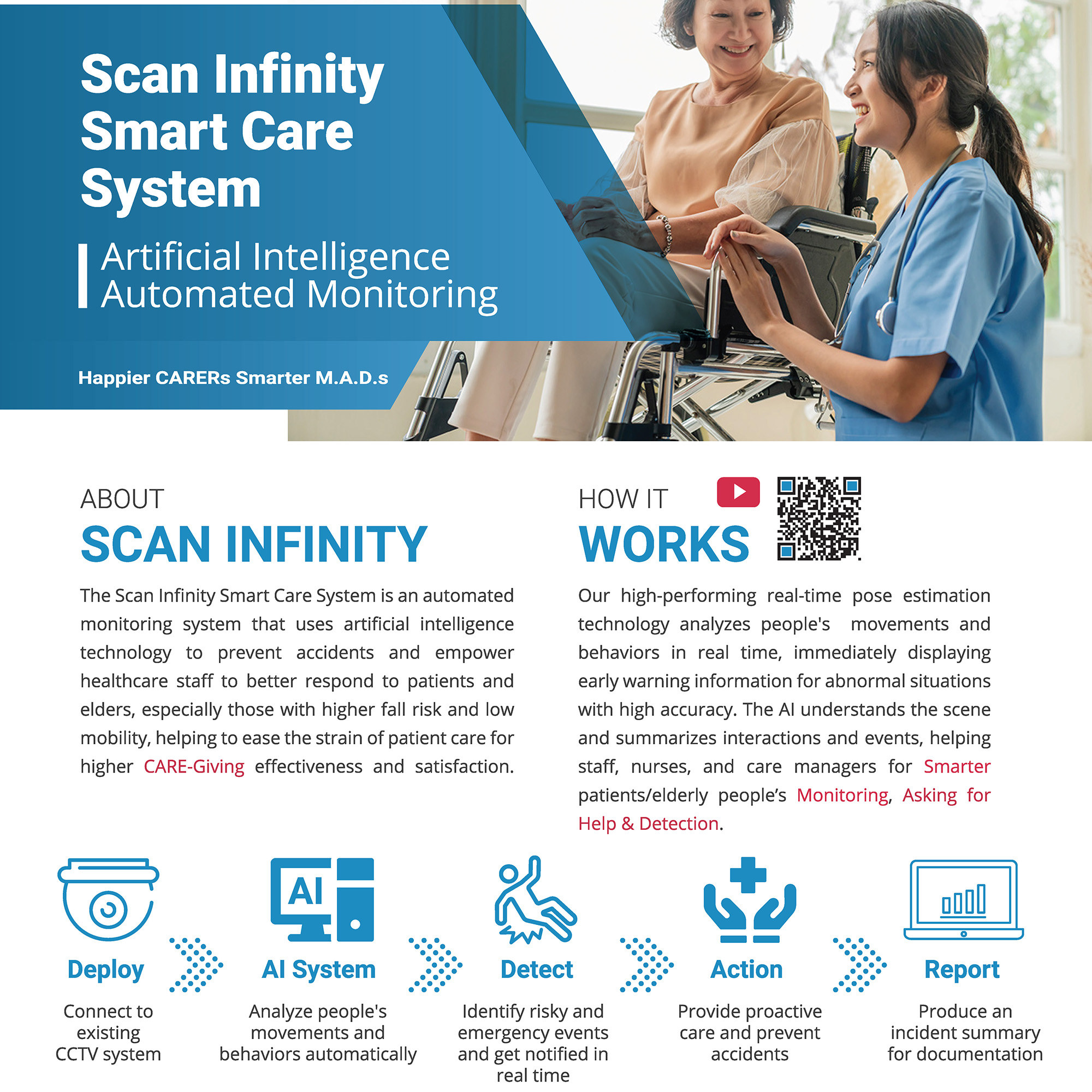 The Scan Infinity Smart Care System is an automated monitoring system that uses artificial intelligence technology to prevent accidents and empower healthcare staff to better respond to patients and elders, especially those with higher fall risk and low mobility, helping to ease the strain of patient care for higher CARE-Giving effectiveness and satisfaction.