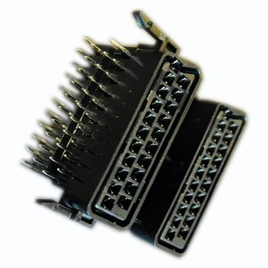This SCART socket is made of brass with a thermoplastic contact. It comes with mounting flanges for screws. It is applicable to set-top boxes, digital video recorders, digital TVs, etc.