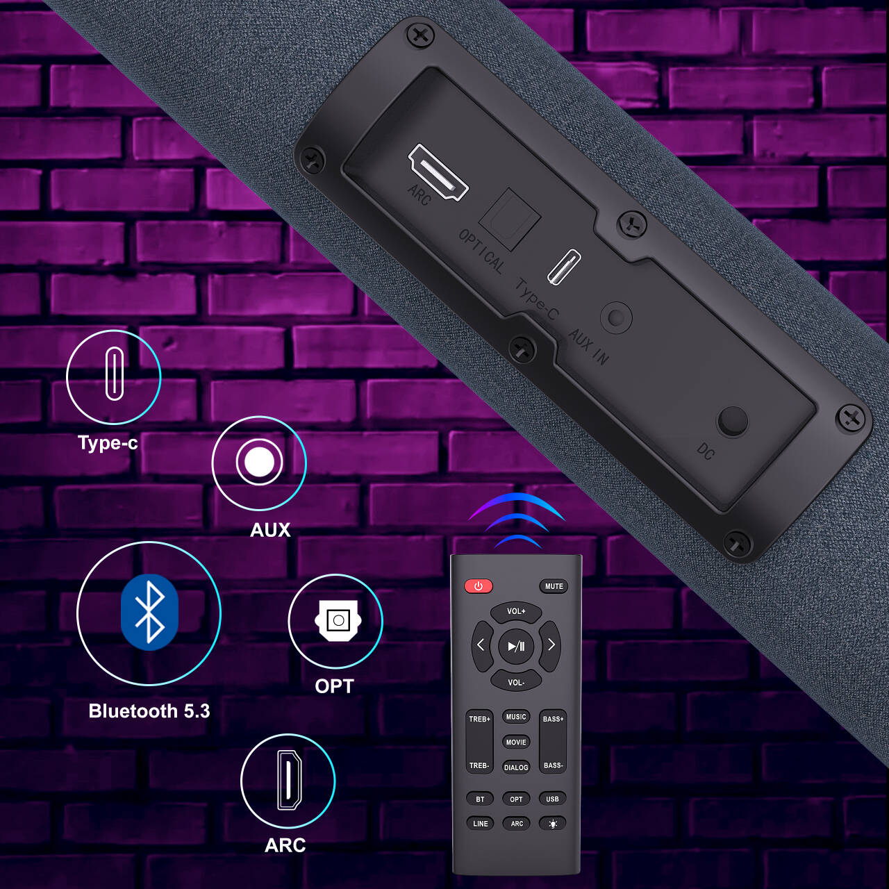 -Versatile Connectivity: BT, AUX, ARC, OPT, and TYPE-C (sound card) ensure compatibility with a wide range of devices.