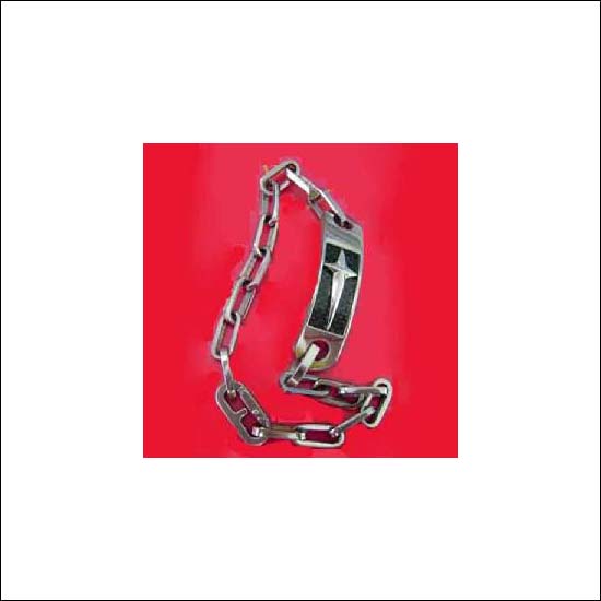 A silver bracelet with cable link chain and a plated tag.