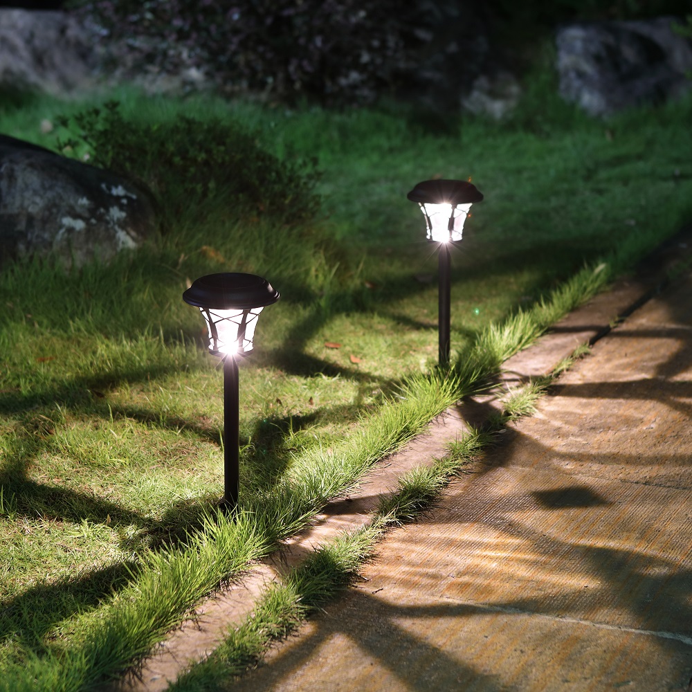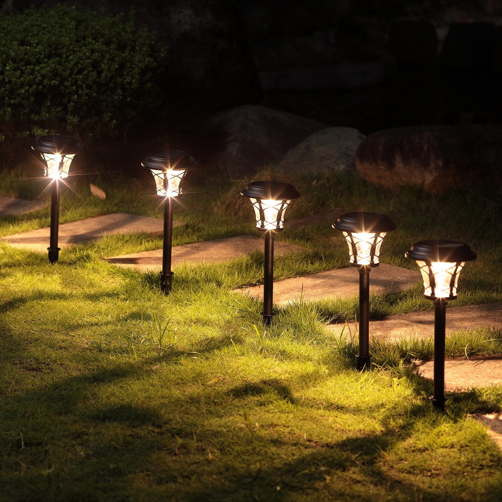 The solar light has a solar panel that converts sunlight into electricity. During the day, the converted electricity is stored in the rechargeable Ni-MH batteries. At night, the solar light is powered by the batteries using the electricity stored during the day.