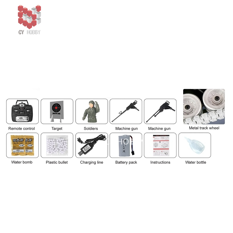 | Basic functions: 1:18 remote control tank (2.4G/ variable speed) Forward :1: slow forward: 2: medium speed forward: 3: fast forward right retreat :1: slow speed backward 2: medium speed backward 3. Fast reverse turn: 1: slow left front turn 2: medium speed right front turn slow left back turn fast right back turn turn: 1: slow left front turn 2: medium speed right front turn slow left back turn fast right back turn 3: turn 360:4: left turn 5: right turn battery: 1: battery left turn 2: battery right turn gun barrel: 1: barrel swing up and down 2: BB shot 3: water shot 4: barrel shrink body 1: gun simulation recoil 2: machine gun simulation 3: simulation standby sound and control. On/off simulation driving sound. Note: The battery is charged for 2 hours and can be used continuously for 50-60 minutes. It is equipped with 200 BB bullets, 1000 water bullets, 7.4V,USB charging cable, and 7.4V1200MA lithium battery. Remote control 4AA does not include smoke | |||
