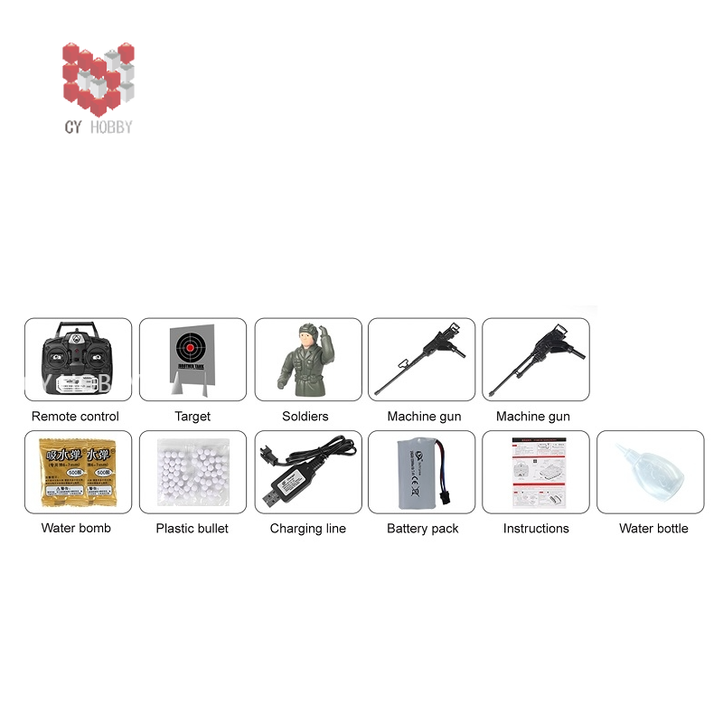 | Basic functions: 1:18 remote control tank (2.4G/ variable speed) Forward :1: slow forward: 2: medium speed forward: 3: fast forward right retreat :1: slow speed backward 2: medium speed backward 3. Fast reverse turn: 1: slow left front turn 2: medium speed right front turn slow left back turn fast right back turn turn: 1: slow left front turn 2: medium speed right front turn slow left back turn fast right back turn 3: turn 360:4: left turn 5: right turn battery: 1: battery left turn 2: battery right turn gun barrel: 1: barrel swing up and down 2: BB shot 3: water shot 4: barrel shrink body 1: gun simulation recoil 2: machine gun simulation 3: simulation standby sound and control. On/off simulation driving sound. Note: The battery is charged for 2 hours and can be used continuously for 50-60 minutes. It is equipped with 200 BB bullets, 1000 water bullets, 7.4V,USB charging cable, and 7.4V1200MA lithium battery. Remote control 4AA does not include smoke | |||