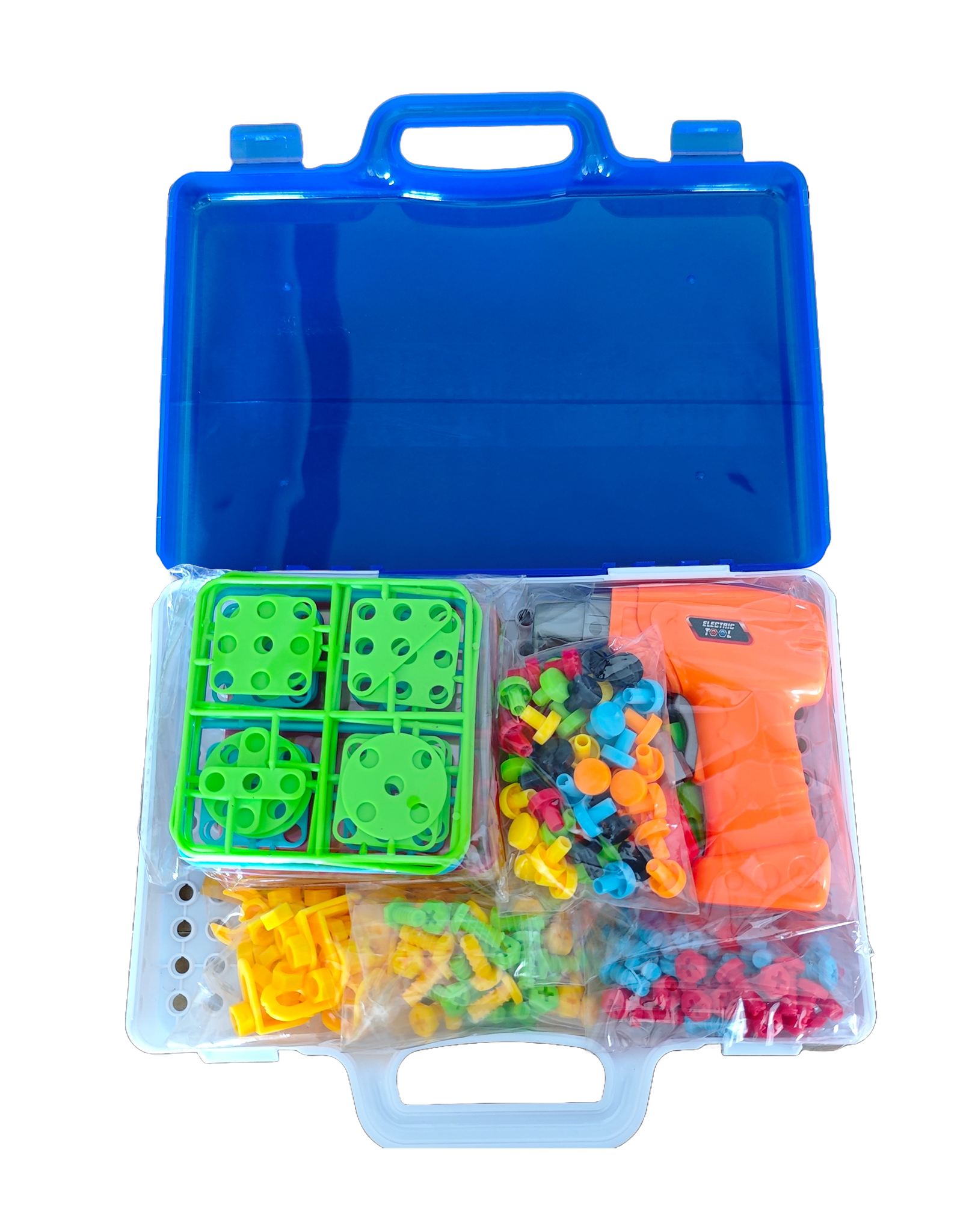 ★ 237Pcs All-In-One STEM Set ★ : Includes interchangeable drill bits, reversible electric drill (requires 2 AA batteries, not included), chunky plastic nuts/bolts, screwdriver, wrench, 43 double-sided pattern instructions, storage bag and portable carrying case. The "Mind and Hand" design encourages hands-on learning, and the large-capacity case keeps all 237 pieces organized for easy transport.