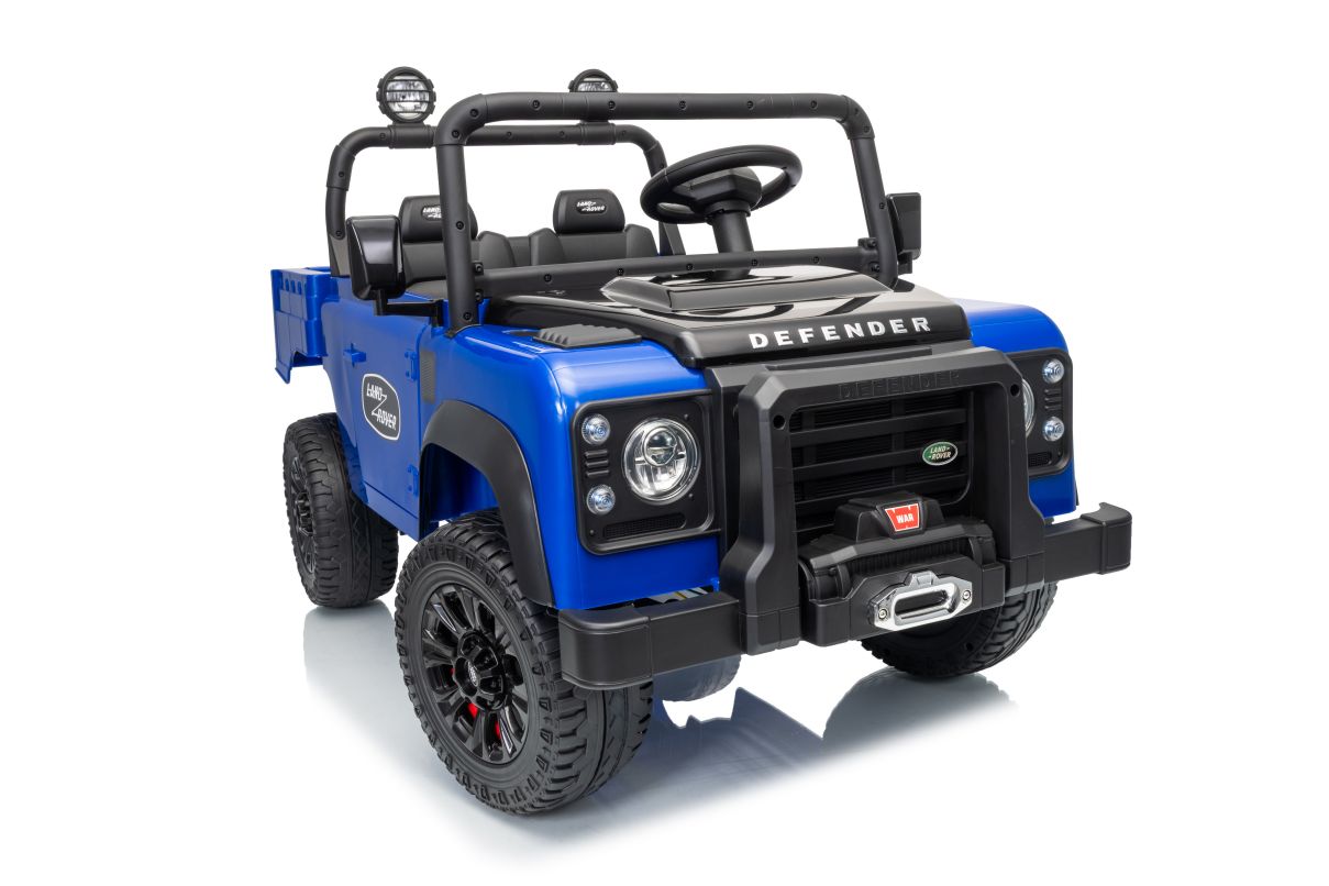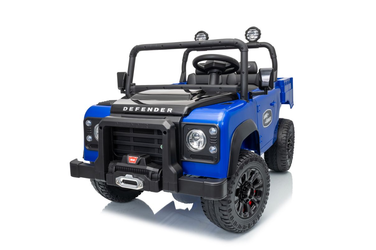 Realistic Off-Road Design: Featuring a bold blue body with black accents, it boasts a Defender-style front grille, round headlights, roof-mounted spotlights, and a front bumper with a tow hook. The open-top frame with side rails ensures visibility while adding to the authentic off-road feel.