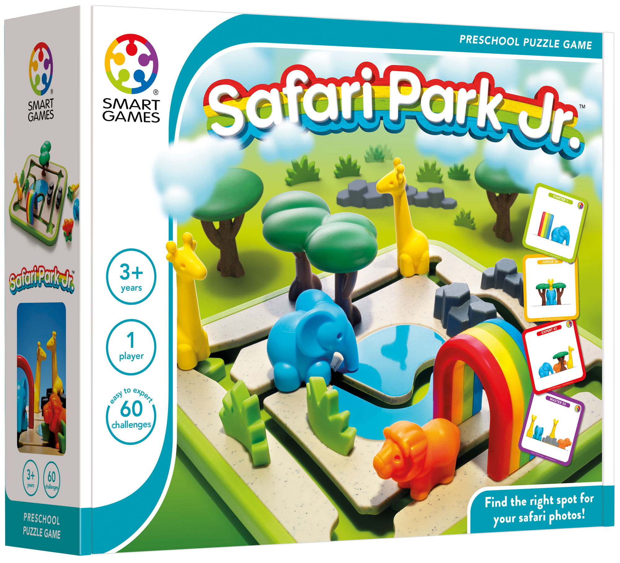3, 2, 1 and pose! These safari animals love to model for your camera! Can you get the animals in the picture-perfect position for the snapshot? Move them around the board... but don’t forget the lion doesn’t like water, the elephant can’t climb over the rocks and the giraffes are too tall to fit underneath the trees! A 2-in-1 learning game for toddlers: solve the puzzles or just play and let your imagination go wild! Learn about shapes and concepts as left, right, on top, in front, and behind. Sort shapes and follow the path. Ready to have a wild time?