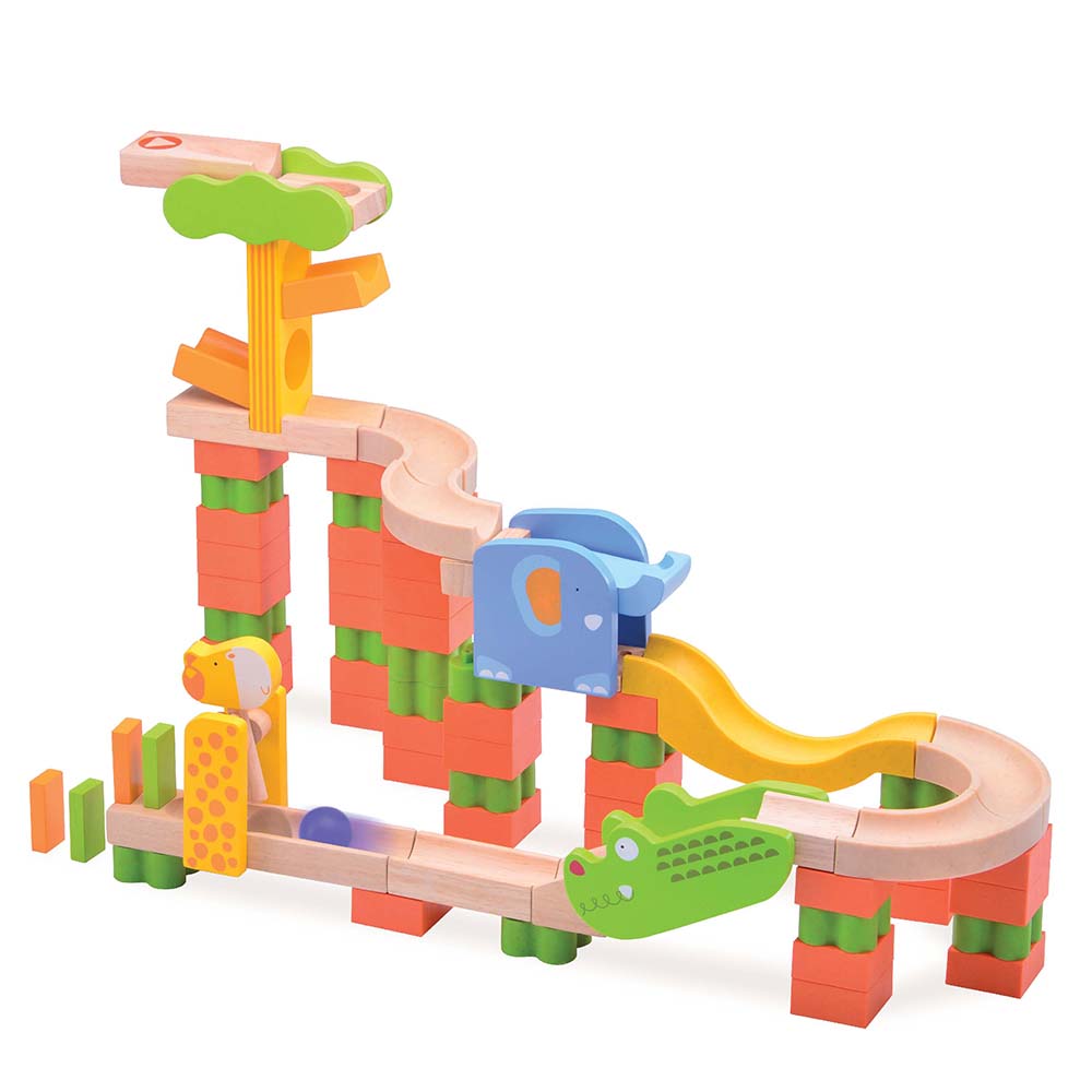 The featured safari track is a track for balls to roll down. There are straight and curved tracks in wooden tone and blocks for supporting the tracks. It comes with safari animals and each animal has a different trick to make this safari track more fun.