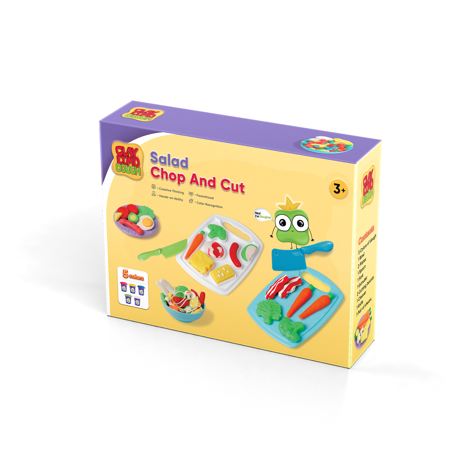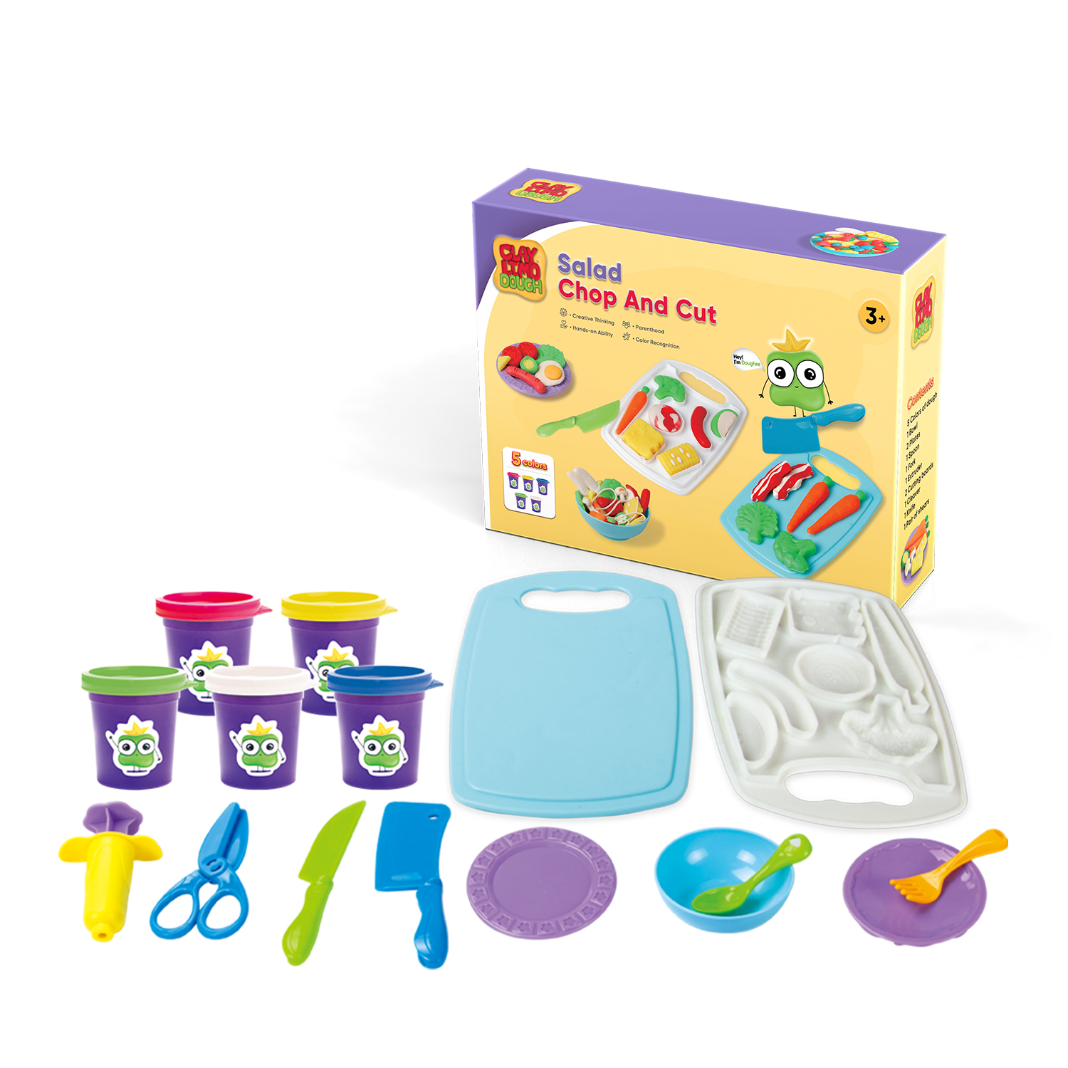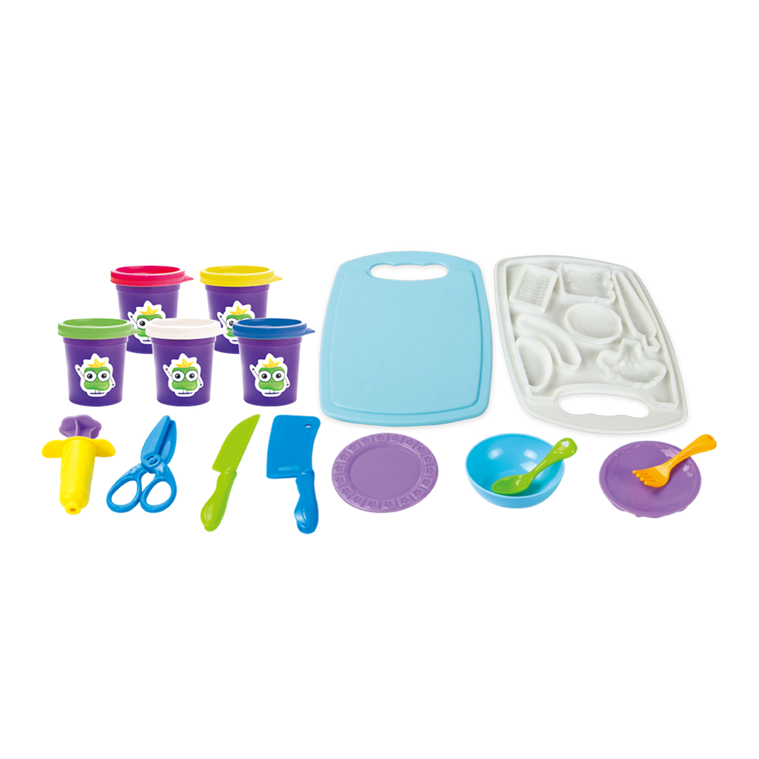 5 colours of 2oz dough,1 bowl,2 plates,1 spoon,1 fork,1 extruder,2 cutting boards,1 cleaver,1 knife,1 pair of shears