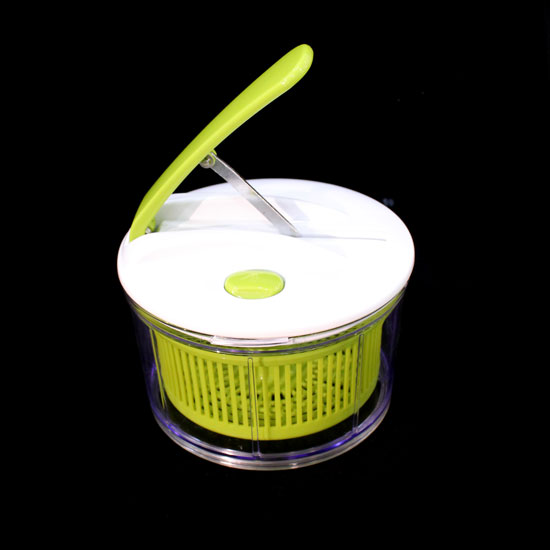 Highlighted is a salad spinner designed to make salad in no time. Simply press the top button and spin the vegetable to dry. Users may press the blade to cut the vegetable when spinning.
