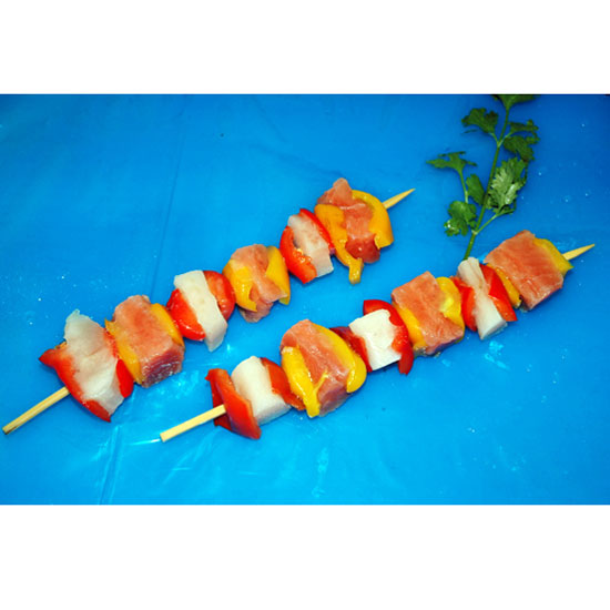 These salmon skewers are well prepared with salmons and peppers. The skewers are well frozen for long-time fresh-keeping. These salmon skewers are great for home BBQ parties.