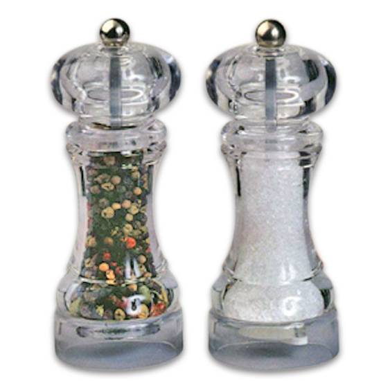 The salt and pepper mills featured here are made of acrylic material. More than 20 choices in salt and pepper mills are available for selections. The precision grinding mechanism used achieves grinds from very fine to very coarse.