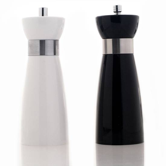 This is a salt and pepper mill. It features a ceramic grinder. It is made of acrylic.