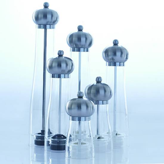 This is a salt and pepper mill. It is made of acrylic and stainless steel. Different sizings are available.