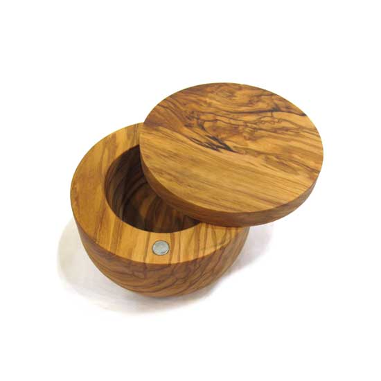 This distinctive salt container is constructed from olive wood for a natural touch. It comes with a round flat lid and an oval base. This sturdy salt container with vivid wood grains is a great addition to your home.