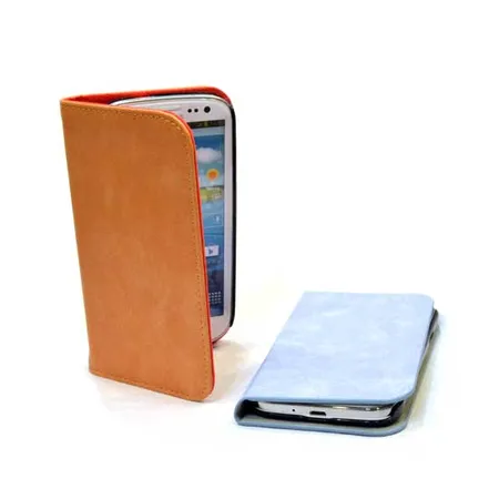 This Samsung Galaxy S4 case keeps your shiny new smartphone protected against dust and bumps. The case is finely made of quality suede PU leather for a soft touch. The case comes with light blue and orange colors for your selection.