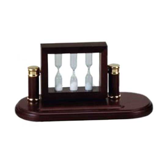 Displayed is a sand timer that comes in a wooden colored frame. Designed with three glass bulbs in a row, this sand timer can keep the time of one, two and three minutes. This elegant sand timer is a good choice as a desktop gift.