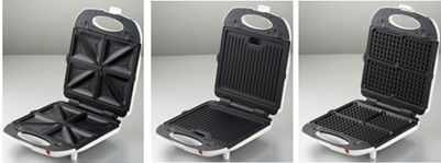 Can be opened on both 105 or 180 degree, with interchangeable plates available: sandwich/grill/waffle.