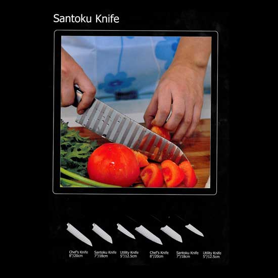 This Santoku knife flaunts thin vertical frictional hollows for a stable cut. Boasting an ultra sharp blade, the knife exhibits excellent balance, offering the most efficient cutting experience. It makes a must-have kitchenware item.