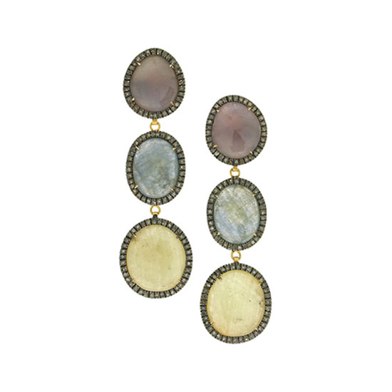 Displayed is a pair of sapphire earrings that comes in a dangle style. Three round sapphire stones in different colors are polished finely and chained in a row for a fashionable look. The sapphire is accented with sparkling diamonds for an extra shine.
